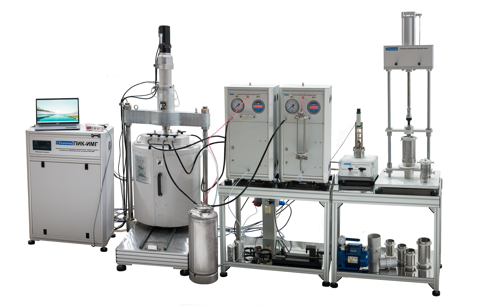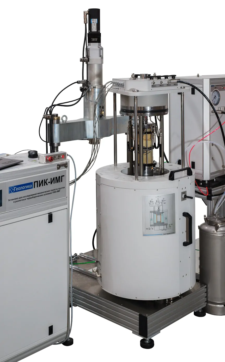 Установка для исследования механических свойств грунтов в различных термобарических условиях ПИК-ИМГ предназначена для проведения испытаний образцов многолетнемерзлых и дисперсных грунтов в условиях осесимметричного анизотропного трёхосного сжатия в диапазоне температур от минус 20 до плюс 80°С, с осевым усилием до 100 кН.