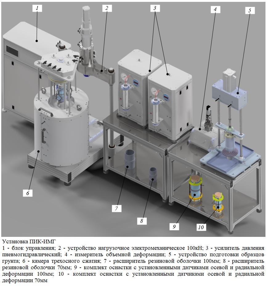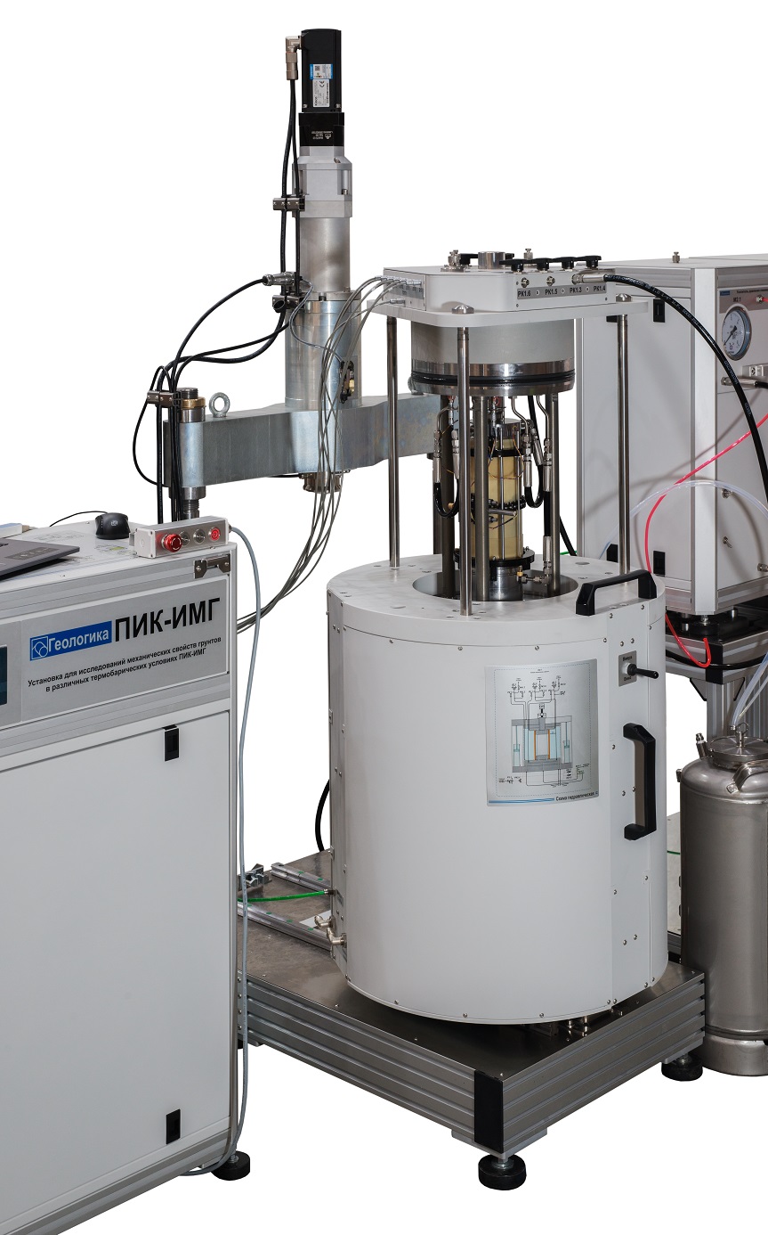 Программно-измерительный комплекс для изучения механических свойств грунтов в различных термобарических условиях ПИК-ИМГ способен обеспечивать вертикальную нагрузку до 100 кH и создавать давление обжима и фильтрации до 4МПа. В процессе работы измеряются параметры осевой, радиальной, объемной деформации, созданное вертикальное усилие, контролируются параметры прикладываемого давления. Контрольно-измерительная система управляет изделием, измеряет и фиксирует необходимые параметры. Анализируя графики, оператор вычисляет требуемые параметры.